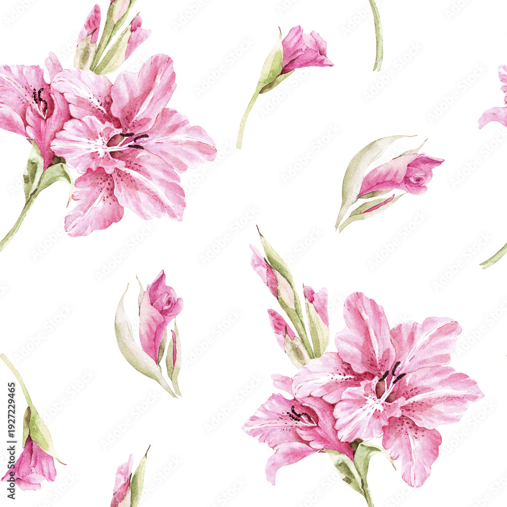 Seamless pattern with pink gladioli and buds on a white background. Hand-drawn watercolor illustration. #1927229465