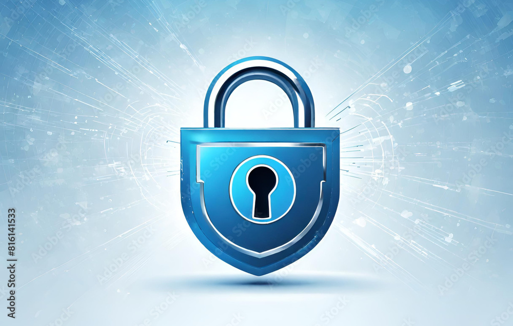• #816141533 Security data online Iot technology concept, blue lock symbol digital illustration, Modern Holographic Padlock for Cybersecurity Technology