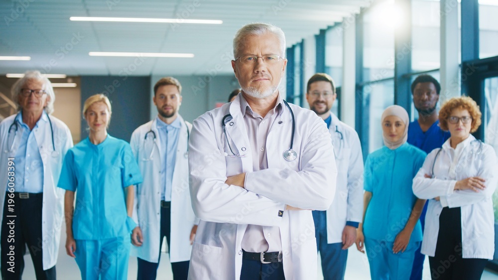 Serious male doctor with crossing arms standing in hallway. Skilled medical professional and his proud team showing responsibility. Working together during busy hospital routine. Healthcare. #1966068391