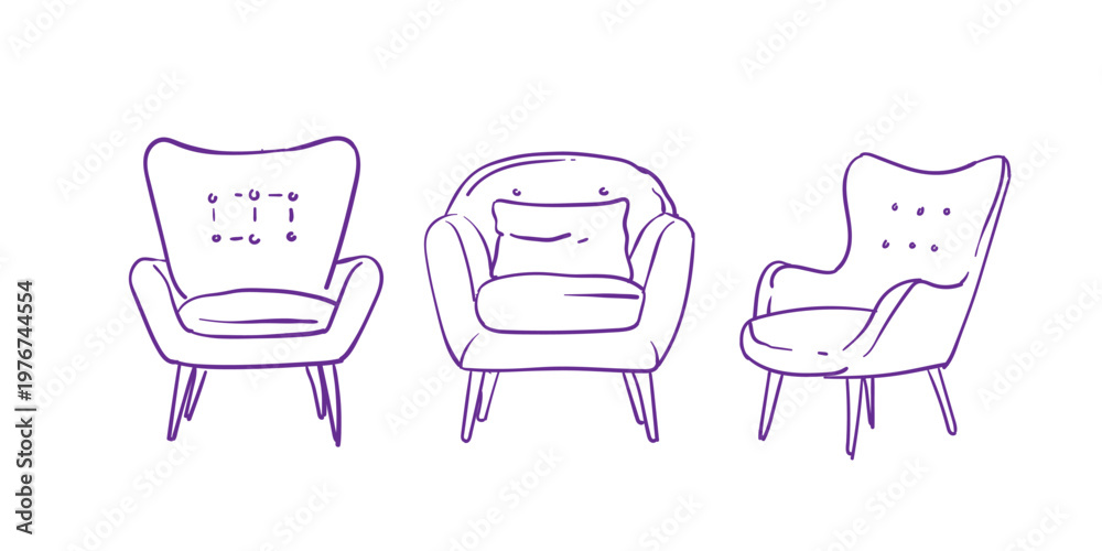Set of armchair outline sketch. hand drawn linear chairs collection. Line art illustration of soft furniture. Scandinavian armchairs sketches. Vector illustration design #1976744554