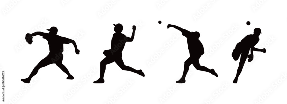 Set of black silhouettes of baseball pitchers in various throwing motions. Flat vector illustration of athlete poses for sports promotion, coaching materials, and competition posters. #1941676023