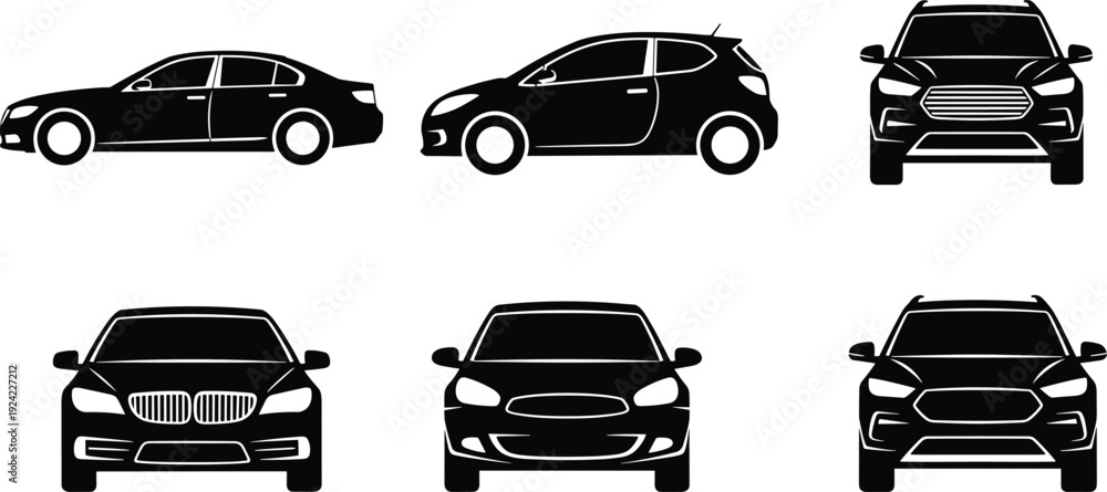 Set of car silhouette icons including sedan, hatchback, and SUV models from front and side views for automotive design and transport. #1924227212