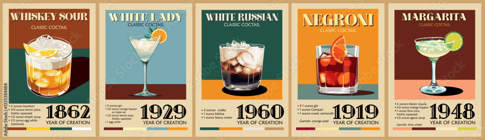Set of Cocktail retro posters with recipe. Classic White Russian, Negroni, Margarita cocktails digital print. Popular alcohol drinks. Vintage vector illustration, bar, pub, restaurant, kitchen decor #1355384484