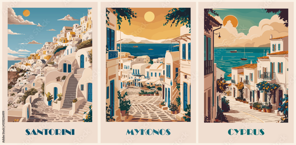 Set of Greece Travel Destination Posters in retro style. Santorini, Mykonos, Cyprus digital prints. European summer vacation, holidays concept. Vintage vector colorful illustrations. #1318256499