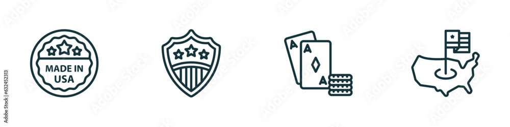 set of 4 linear icons from united states of america concept. outline icons included made in usa, usa shield, casino, united states vector #632452313