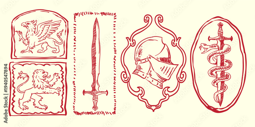 Set of medieval fantasy heraldic print, hand drawn gothic vintage mythology beasts line, RPG game sticker. ancient magic manuscript illustration, dragon logo royal knight shield emblem design #1940547894