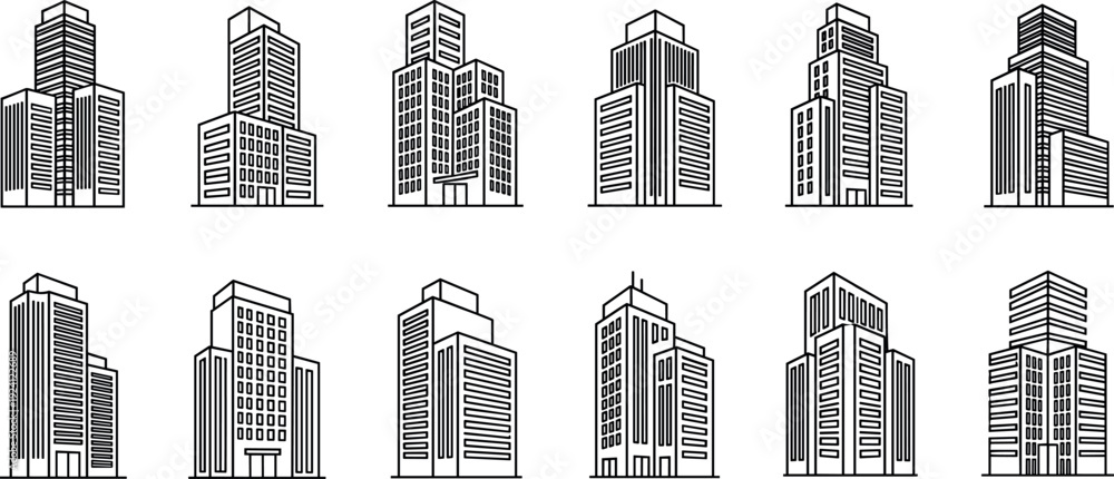 Set of modern line style skyscraper and city building silhouettes for urban architecture and real estate design #1924122689