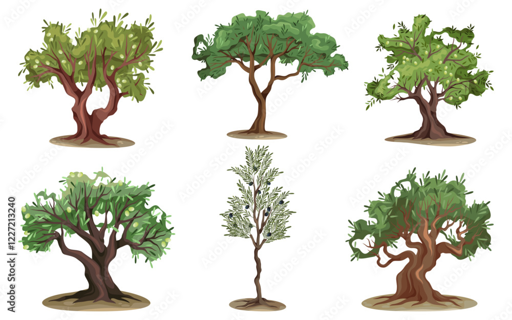Set of olive tree types vector illustration. Variety of flora with distinctive crown and branch shapes, foliage. Outdoor mediterranean vegetarian fruit plant. Agriculture orchard, botany. Nature. #1227213240