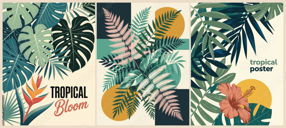 Set of tropical posters with lush jungle leaves, monstera, palm, and hibiscus flowers. Vibrant flat vector botanical illustrations with bold geometric backgrounds and modern typography #1737368801