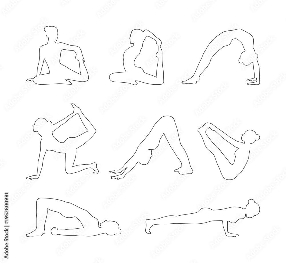 Set of yoga poses and silhouettes in thin line art style. Minimalist vector illustration of women practicing various hatha yoga asanas for health, fitness, and meditation designs. #1952800991