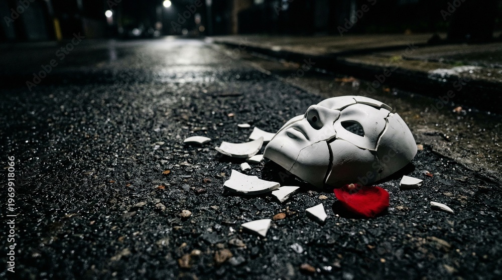 Shattered white mask and red rose petal lie on dark wet street at night, dramatic mood #1969918066