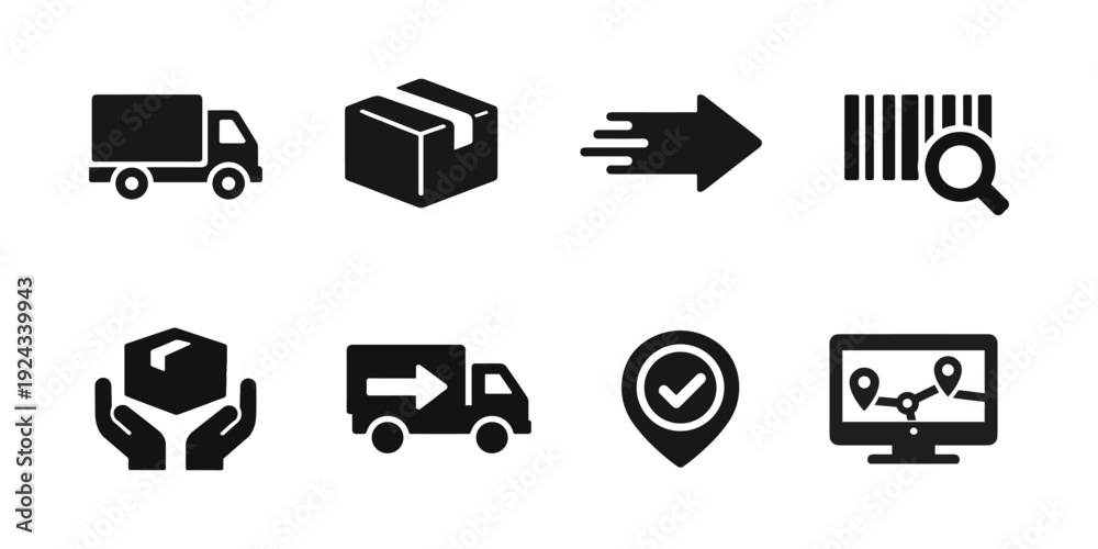 Shipping, delivery tracking, transport, cargo, solid black icon set vector illustration #1924339943