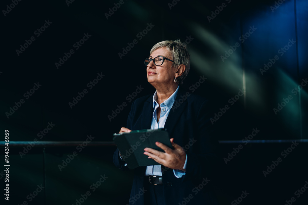 Side portrait of senior woman using tablet with confident smile. Modern metaphor for balance, control, and self-assurance in digital professional environments. #1943146959