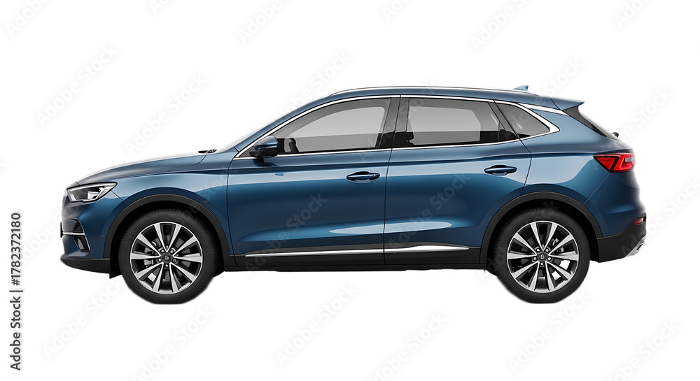 Side view of a blue suv with silver rims parked on a black background in a studio setting today #1782372180