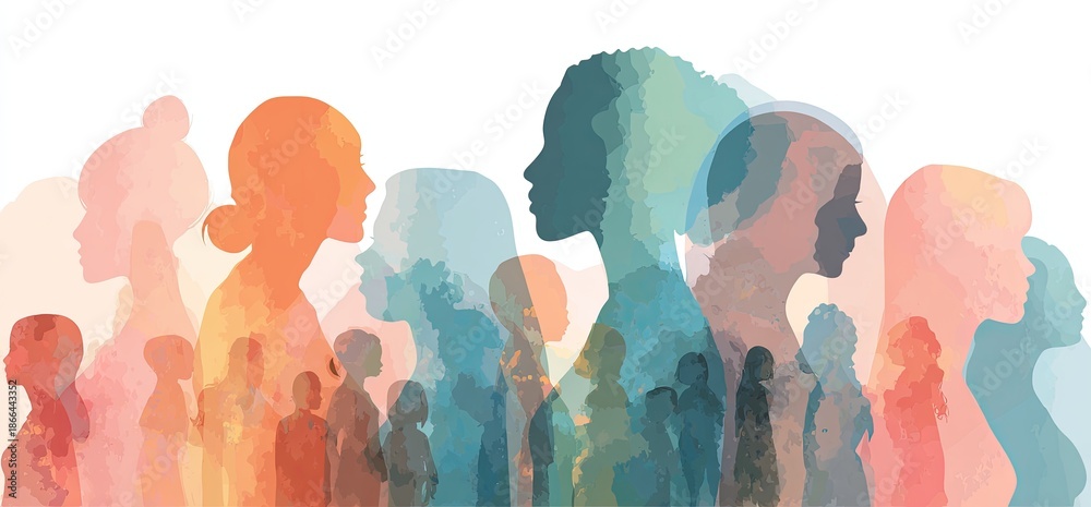 Silhouette portraits of women in layered watercolor hues, conveying diversity and unity #1866443352