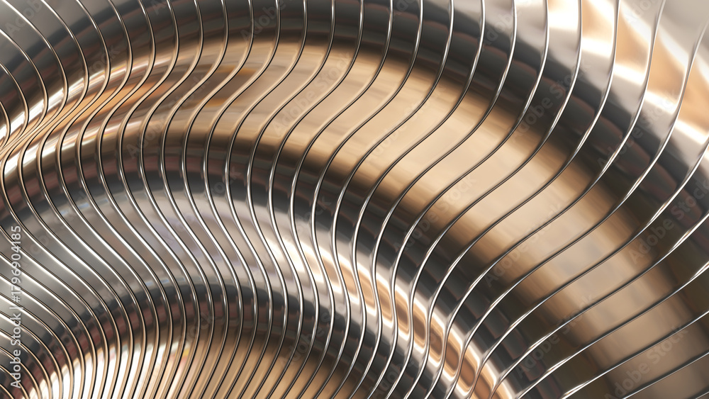 Silver metal striped pattern background, wavy shiny chrome metallic stripes pattern. #1796904185