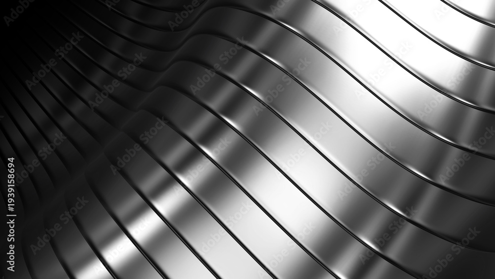 Silver metal striped pattern background, wavy shiny chrome metallic stripes pattern. #1939158694