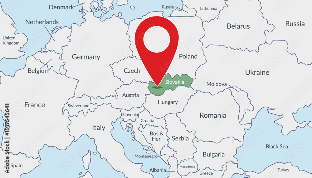 Slovakia on the Europe map with pin location marker3. Vector flat template. #1917545641