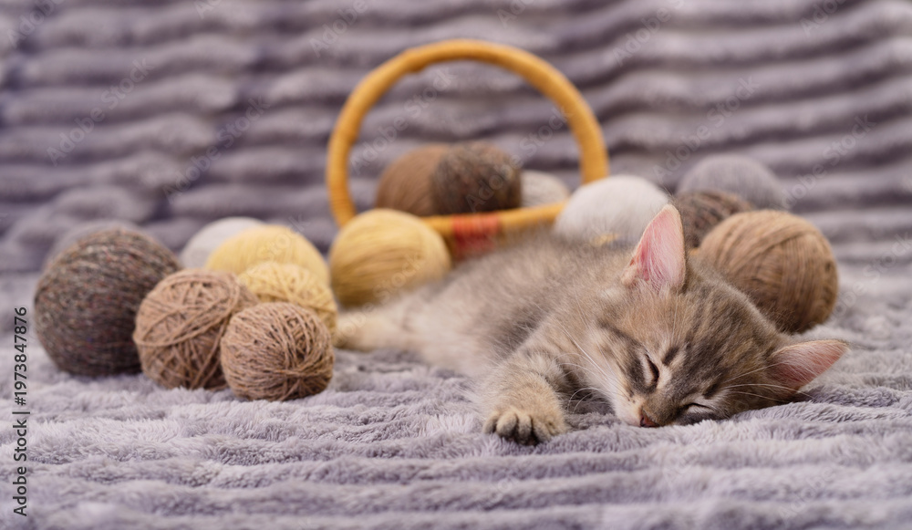 Small kitten sleeping with balls of wool on a soft blanket #1973847876