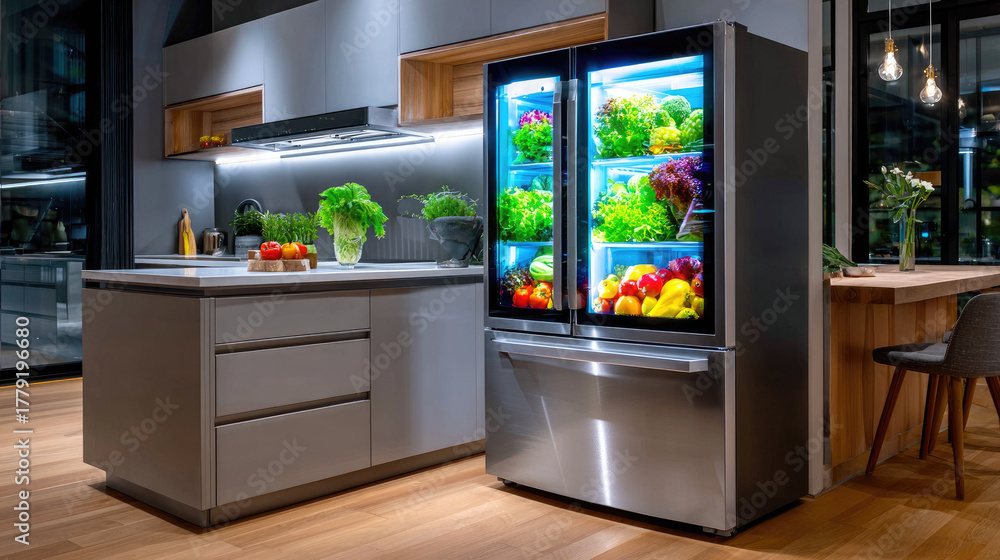 Smart fridge with transparent door and holographic recipe suggestions — modern kitchen technology and innovation concept #1779196680