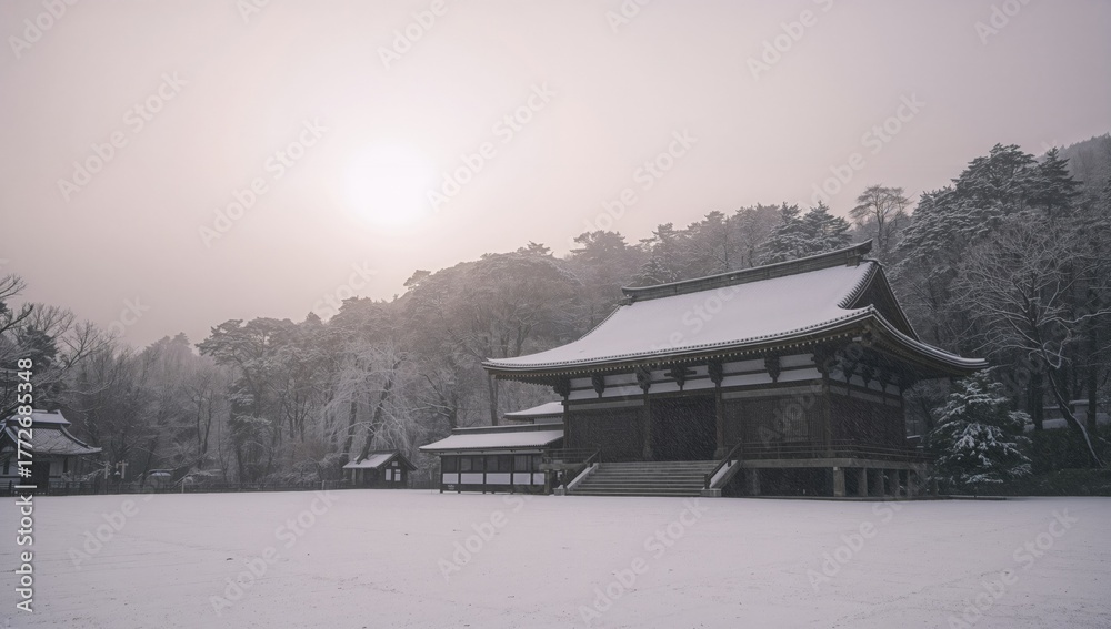 Snow-covered temple in a serene winter forest landscape #1772685348