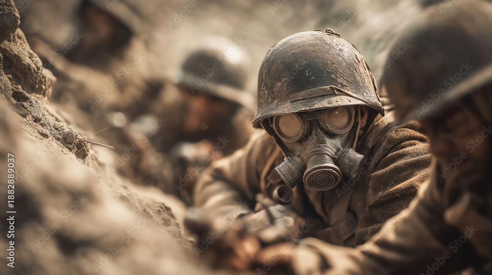 soldiers in gas masks and helmets in dirty war trench #1882889037