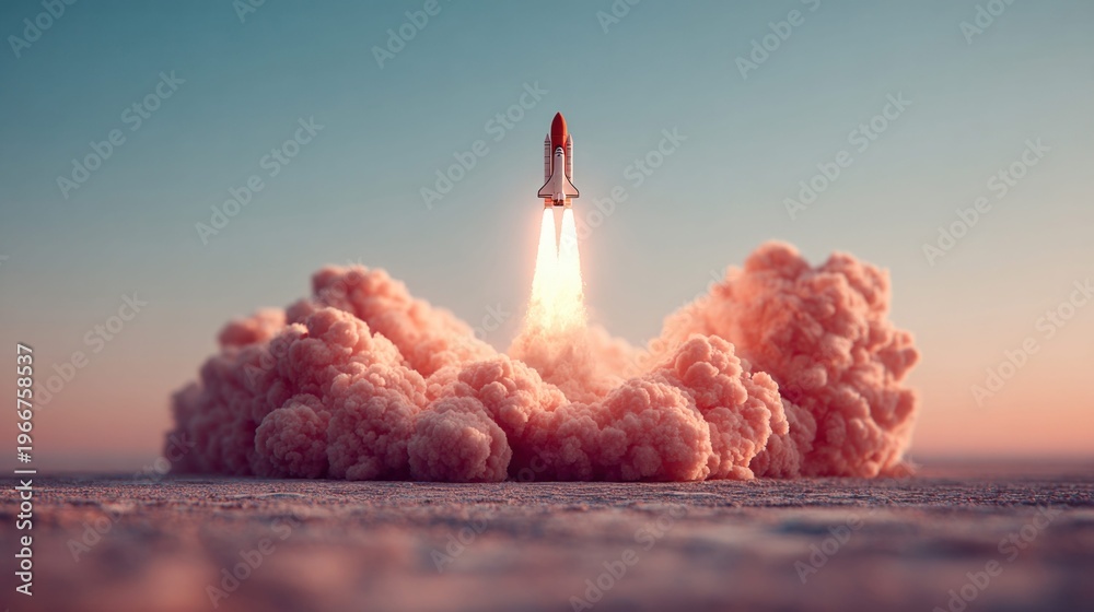 Space shuttle launching into the sky with dramatic pink clouds and bright flames #1966758537