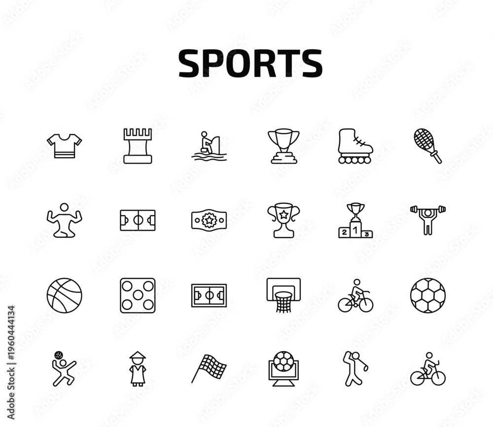 sports outline icon set. 24 linear vector for ui, web and mobile. thin line football jersey, tower from a chess, fisher fishing and more icons. #1960444134