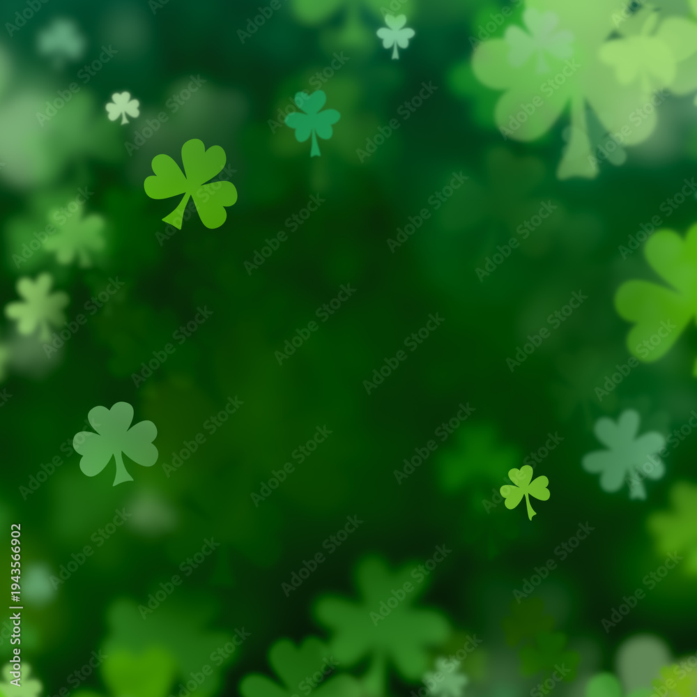 St Patrick's Day background with green 3 leaf clovers. Scattered shamrock or clover shapes in various greens to celebrate lucky tradition of St Patricks Day. Square composition with space for text. #1943566902
