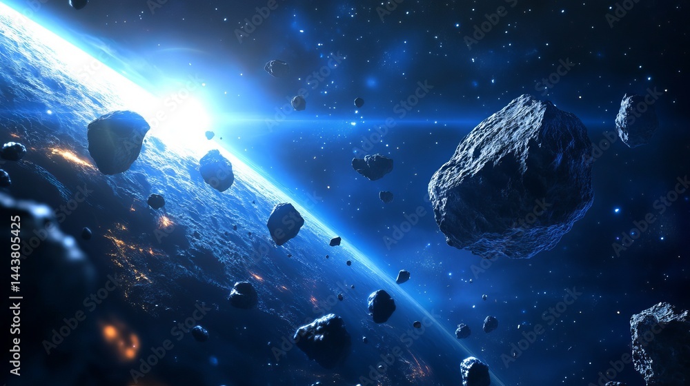 Stunning asteroid field near planet dramatic space scene blue cosmos 3d art sky dark glow rocks image #1443805425