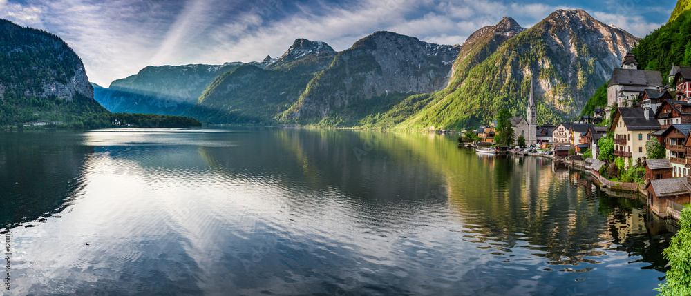 Stunning panorama of Hallstatt lake at dawn, Alps, Austria #120185477
