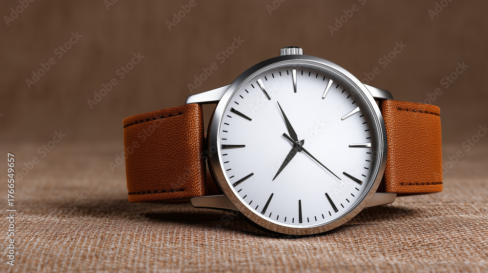 Stylish men's wristwatch with leather strap on fabric, photorealistic #1766549657