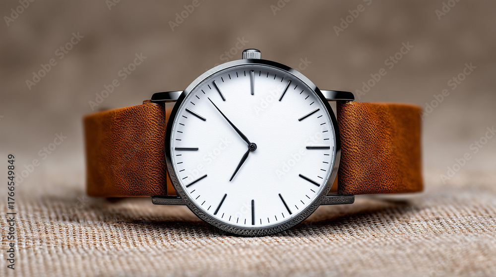 Stylish men's wristwatch with leather strap on fabric, photorealistic #1766549849