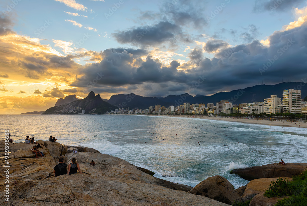 Sunset on Ipanema beach and mountain Dois Irmao (Two Brother) in Rio de Janeiro, Brazil. Ipanema beach is the most famous beach of Rio de Janeiro, Brazil. Cityscape of Rio de Janeiro. #1909398635