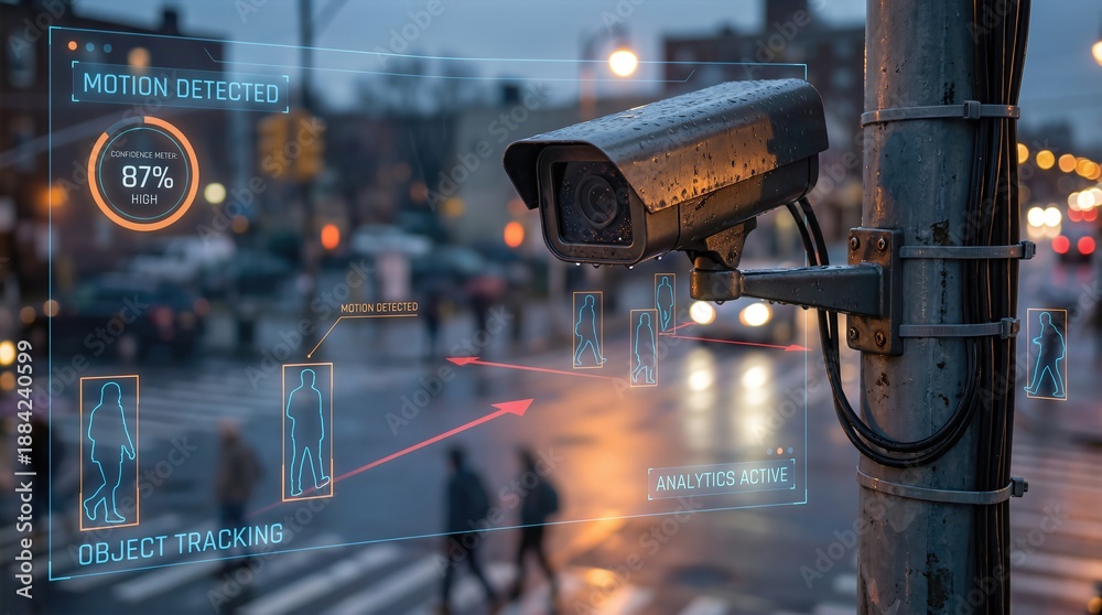 Surveillance camera monitoring urban street scene at dusk, displaying motion detection analytics and object tracking technology, illustrating advanced security systems in action #1884240599