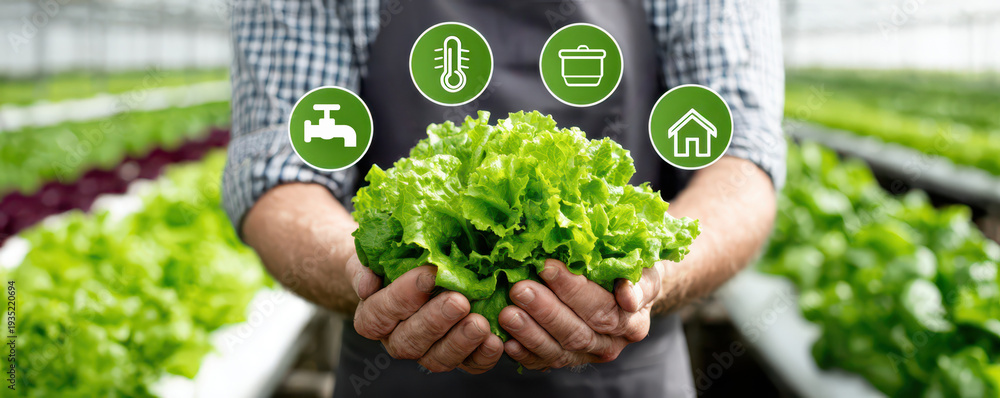 Sustainable Agriculture And Smart Farming Farmer Holding Fresh Lettuce In Greenhouse With Climate Control Technology And Hydroponics System #1935220694