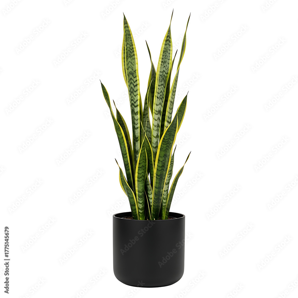 Tall snake plant with yellow-edged green leaves in a black pot on a white background, a popular indoor houseplant. #1775145679