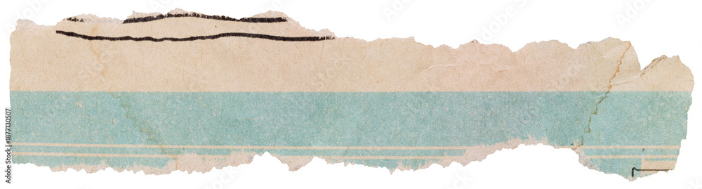 Tear stripe of faded vintage magazine page with blue print, isolated paper element for collage #1877130507