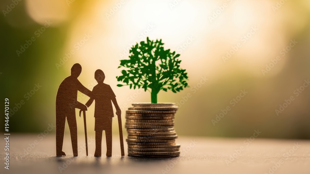 The elderly couple beside a growing money tree symbolizing retirement savings and financial security #1946470129