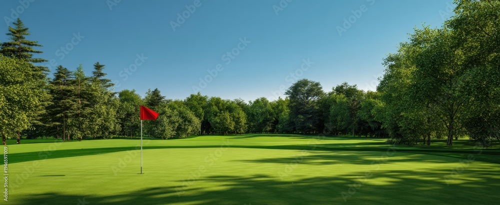 The golf green with red flag on a sunny tree lined championship course #1946597009