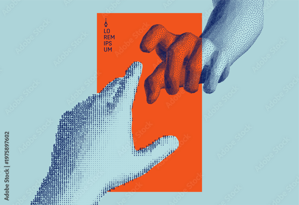 The index fingers of both hands reach toward each other. The concept of relationships, unity, partnership, or contact. Cascading digital code matrix. Artificial intelligence and cognition. Contact. #1975897602