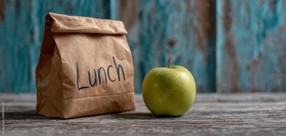 The lunch bag and green apple on rustic wooden table with teal background #1916766526