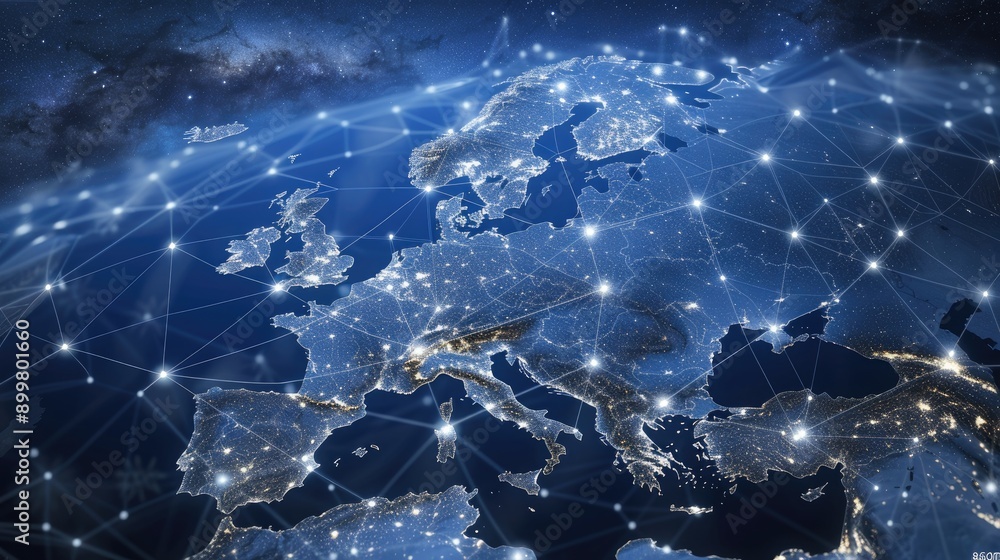 The map displays Europe illuminated at night, highlighting major cities and a network of connections across the continent #899801660