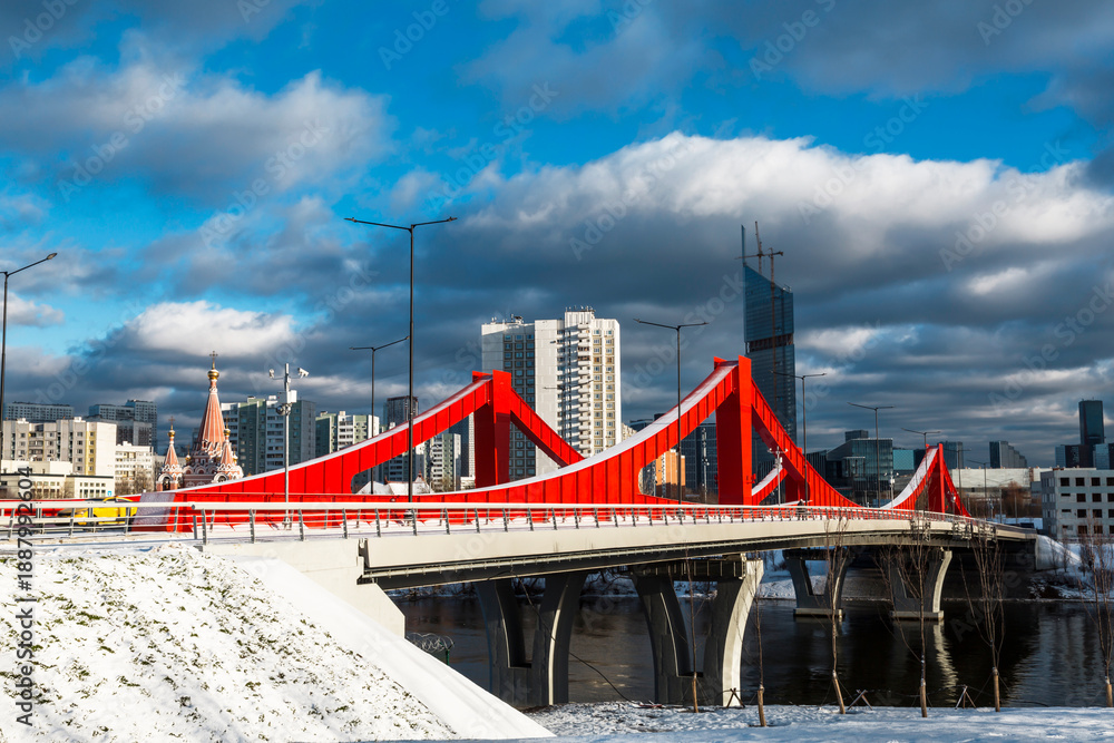 The new red bridge across the Moskva River, connecting the Khoroshevo-Mnevniki and Filevsky Park districts, on a sunny winter day. Moscow, Russia. #1887992604