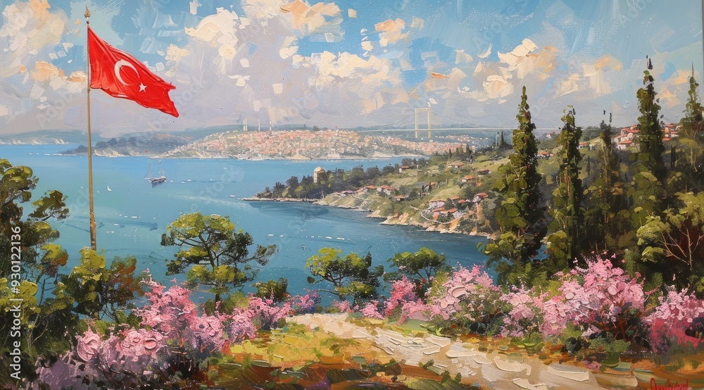 The view of the sea among the greenery. Turkish flag and sea. A good option for vacation #930122136