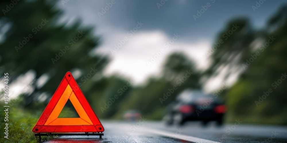 The warning triangle on a roadside beside a blurred moving car #1946574355