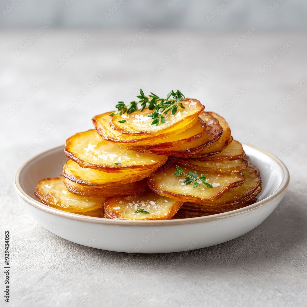 Thinly sliced potatoes stacked and baked until golden and crisp, styled in soft natural light with minimalist plating. #1929434053