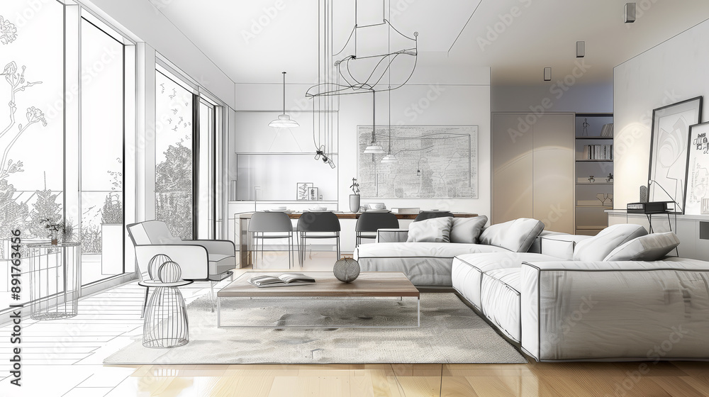 This captivating image showcases a stylish living room interior adorned with modern furniture. Generative AI #891763456