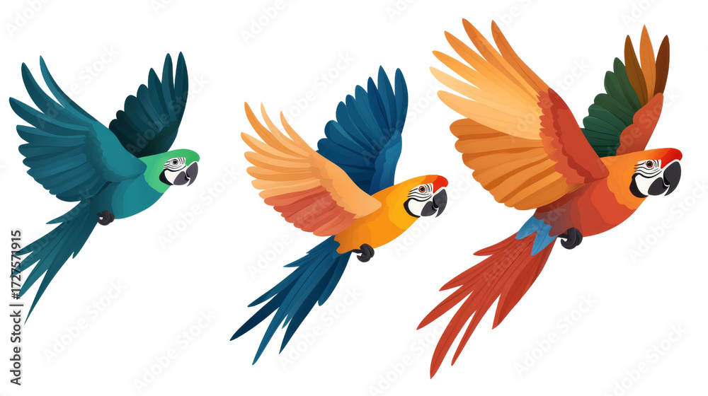 Three Colorful Macaws in Flight, Isolated on Transparent Background, Illustration, Bird, Tropical, Parrot, Avian #1727571915