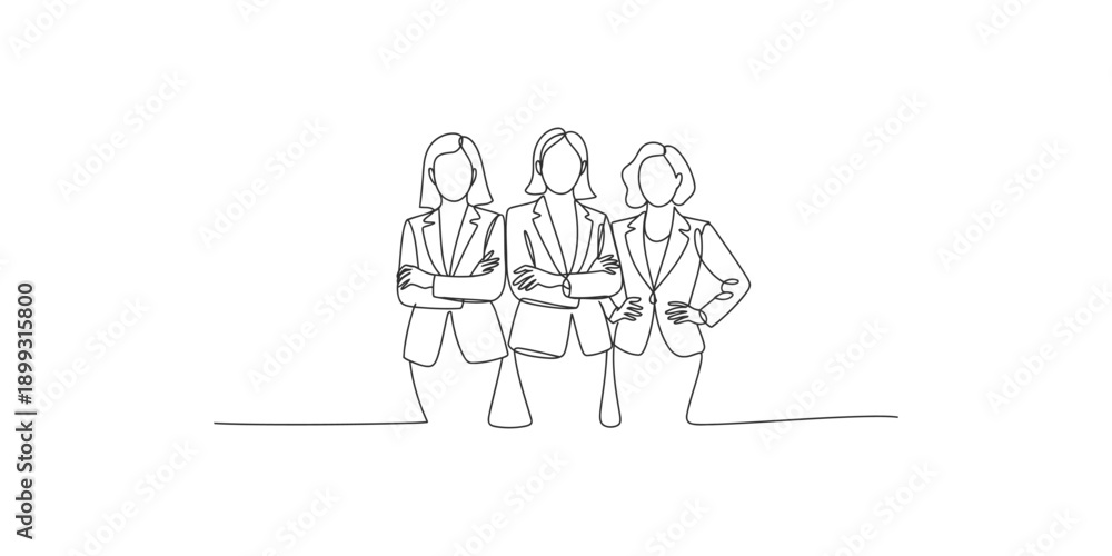 Three professional women standing together in continuous line art representing teamwork and confidence. #1899315800